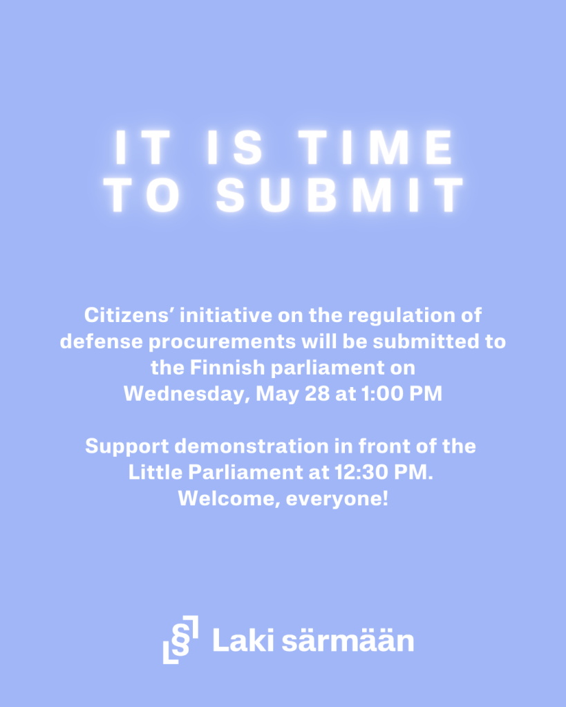 The initiative proposes extending the current export practices to imports and defense procurements. This would make it possible to bring the discussion about war crimes and other violations of international humanitarian law into Finland’s defense procurements, instead of being able to justify procurements from anywhere on the grounds of security policy.